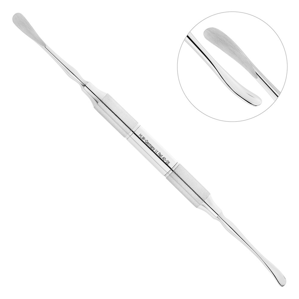 С обоих концов двустороннего инструмента расположены асимметричные рабочие части каплевидной формы шириной 6 и 5 мм. Острая грань с одного края распатора служит для ретракции надкостницы от основной кости, тупая- при фиксации мягких тканей для защиты нерва при использовании вращающихся инструментов.