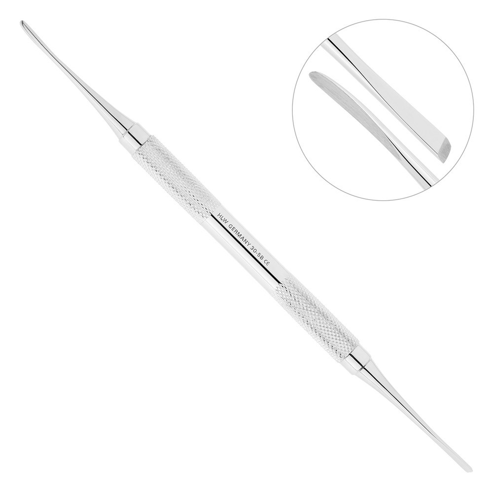 Двусторонний инструмент представляет собой держатель в виде стержня, на обоих концах которого расположены отличные друг от друга рабочие части. С одной стороны распатор имеет закругленную рабочую часть шириной 2,5 мм, с другой - рабочую часть зубцевидной формы с режущей кромкой и шириной 2,5 мм. Благодаря такой конструкции инструмент идеально подходит для различных видов оперативного вмешательства.
