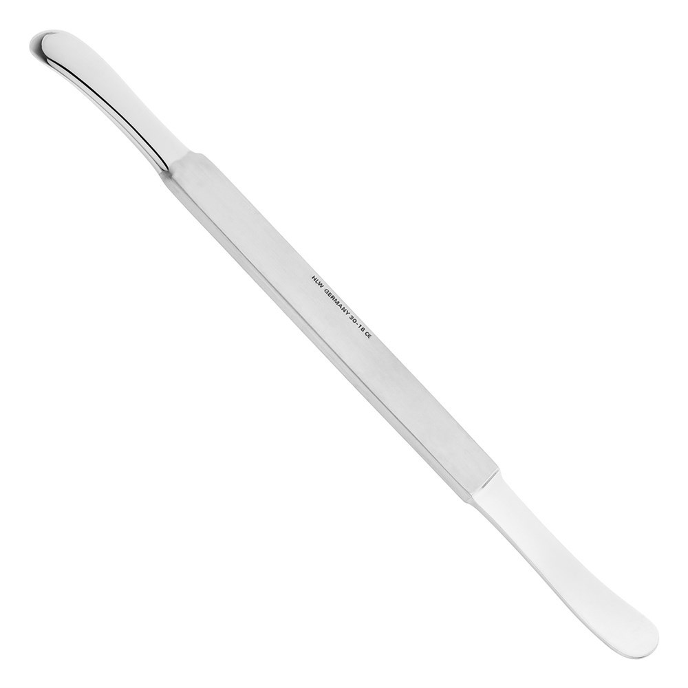 Ручка инструмента двусторонняя. С обоих концов распатора расположены отличные друг от друга рабочие части. Оба остро заточенных конца асимметричного инструмента имеют закругленную форму шириной 12 и 13 мм соответственно. Благодаря такой конструкции распатор идеально подходит для различных видов оперативного вмешательства.