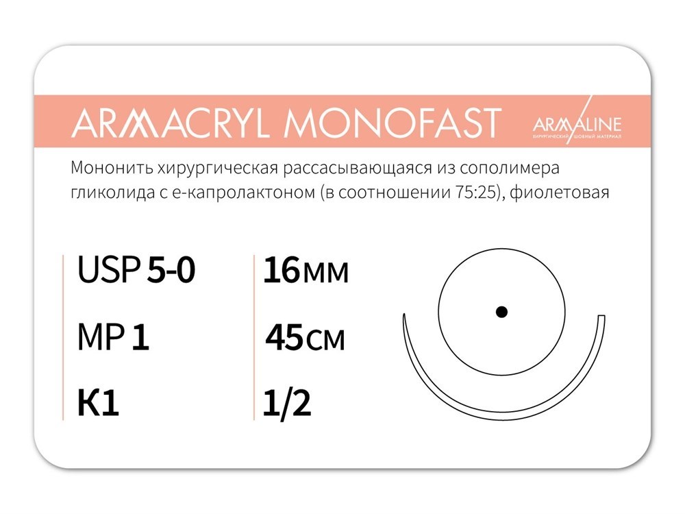 Рассасывающаяся нить с атравматической колющей иглойARMACRYL MONOFAST/Армакрил монофаст (5-0) 45 см - материал хирургический шовный стерильный с атравматической колющей иглой