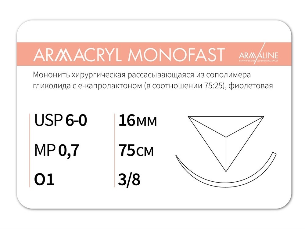 Рассасывающаяся нить с атравматической обратно-режущей иглойARMACRYL MONOFAST/Армакрил монофаст (6-0) 75 см - материал хирургический шовный стерильный с атравматической обратно-режущей иглой