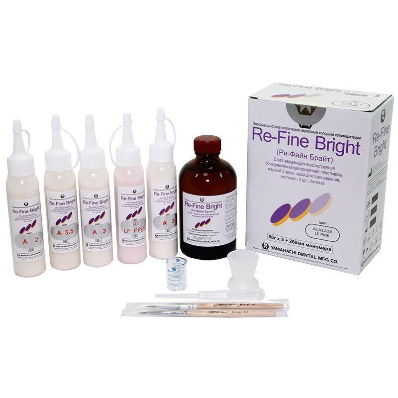 Re-Fine Bright самотвердеющая пластмасса для временных коронок с быстрой полимеризацией, набор SET 1. Данная высокопрочная пластмасса используется для реставрации съемных протезов (ремонт и починка базиса съемного протеза или скола акрилового зуба); изготовления временных коронок и мостов; не прямой перебазировки съемного базисного протеза; облицовки металлических каркасов и замков; замены зуба, выпавшего из съемного протеза; изготовления ортодонтических конструкций.