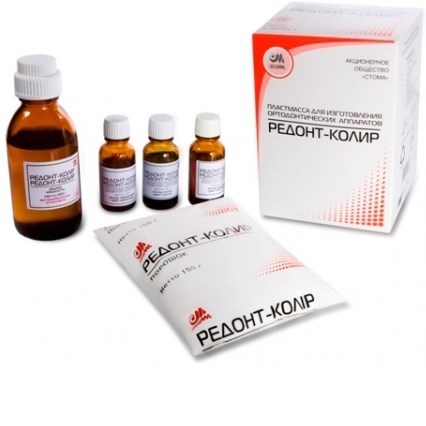 Описание: Редонт-Колир - пластмасса для изготовления ортодонтических аппаратов (порошок 150 г, жидкость 100 г), Стома