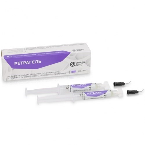 Используется при ретракции десны перед тем, как снять слепок без или с предварительным удалением прилегающих к зубу мягких тканей. Также материал применяется для того, чтобы остановить слабое капиллярное или десневое кровотечение в пришеечной области зуба. "РЕТРАГЕЛЬ" используется в процессе подготовки к фиксации постоянных протезов.