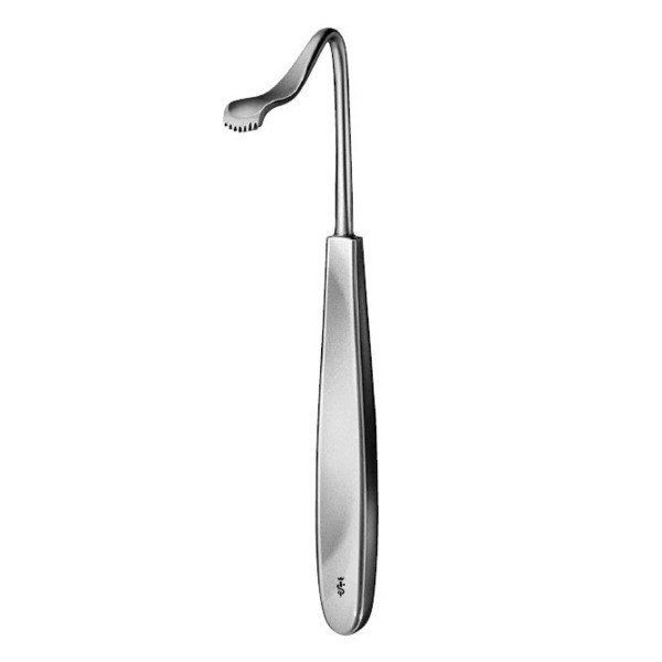 Крючок, по BOWDLER-HENRY, длина 190 мм, DO470R, B.Braun (Aesculap, Германия) применяется для фиксации лоскута мягких тканей во время проведения стоматологических процедур. Инструмент изготовлен из высококачественной нержавеющей стали, имеет удобную рукоятку в виде вытянутого эллипса с продольными гранями по внешней стороне, которые позволяют надежно захватить крючок и снизить нагрузку на кисть. Рабочая часть удлиненная с тройным штыковидным изгибом по плоскости и с зубчиками на конце. Благодаря этому инструмент можно использовать на труднодоступных участках полости рта и надежно крепить на лоскуте мягких тканей, предотвращая его выскальзывание.