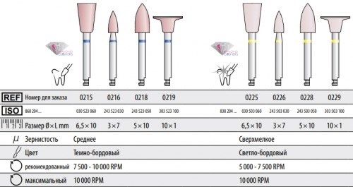 Используются для полировки краев оксида циркония, контактных пунктов и окклюзионных поверхностей.