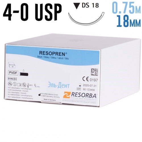 Описание: Резопрен 4-0 USP, 0.75 м, 18 мм, 36 шт, синийМатериал шовный хирургический с иглами атравматическими и без игл: РЕЗОПРЕН (RESOPREN), нить синяя 4/0(1.5) 75см; игла: DS 18мм., 3/8 обратно-реж. РЕЗОПРЕН представляет собой монофиламентный нерассасывающийся шовный материал из поливинилденди флуорида.   Область применения Ввиду высокой стойкости и возможности изготовления прочных узлов РЕЗОПРЕН особенно хорошо пригоден для вживления долговременных имплантов в сосудистой хирургии. Он широко применяется для сшивания и наложения лигатур мягких тканей, в том числе при нейрохирургических, офтальмологических и сердечно-сосудисных вмешательствах. Кроме того, РЕЗОПРЕН применяется в качестве кожной нити, прежде всего в пластической хирургии.   ПРИМЕНЕНИЕ Выбор шовного материала для использования в каждом отдельном случае производится в соответствии с состоянием пациента, опытом хирурга, техникой операции и размерами раны.   ДЕЙСТВИЕ РЕЗОПРЕН обусловливает вначале лишь ограниченную воспалительную тканевую реакцию, за которой следует постепенное, медленное формирование соединительной капсулы.Шовный материал Резопрен.Монофиламентная, синтетическая нерассасывающаяся нить из поливинилдендифлуорида. Устойчив к ферментному воздействию со стороны организма, не подвергается гидролизу.   Упаковка 36 шт/уп.