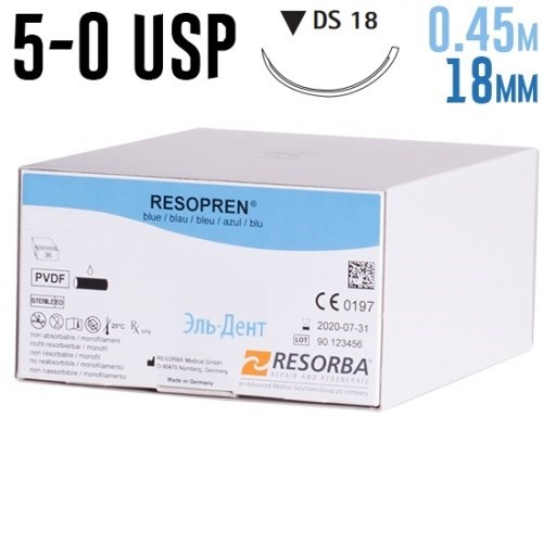 Описание: Резопрен 5-0 USP, 0.45 м, 18 мм, 36 штМатериал шовный хирургический с иглами атравматическими и без игл: РЕЗОПРЕН (RESOPREN), нить 5/0(1) 45см; игла: DS 18мм., 3/8 обратно-реж. РЕЗОПРЕН представляет собой монофиламентный нерассасывающийся шовный материал из поливинилденди флуорида.   Область применения Ввиду высокой стойкости и возможности изготовления прочных узлов РЕЗОПРЕН особенно хорошо пригоден для вживления долговременных имплантов в сосудистой хирургии. Он широко применяется для сшивания и наложения лигатур мягких тканей, в том числе при нейрохирургических, офтальмологических и сердечно-сосудисных вмешательствах. Кроме того, РЕЗОПРЕН применяется в качестве кожной нити, прежде всего в пластической хирургии.   ПРИМЕНЕНИЕ Выбор шовного материала для использования в каждом отдельном случае производится в соответствии с состоянием пациента, опытом хирурга, техникой операции и размерами раны.   ДЕЙСТВИЕ РЕЗОПРЕН обусловливает вначале лишь ограниченную воспалительную тканевую реакцию, за которой следует постепенное, медленное формирование соединительной капсулы.Шовный материал Резопрен.Монофиламентная, синтетическая нерассасывающаяся нить из поливинилдендифлуорида. Устойчив к ферментному воздействию со стороны организма, не подвергается гидролизу.   Упаковка 36 шт/уп.
