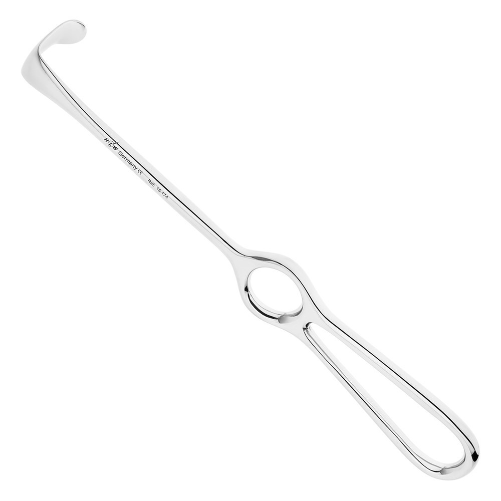 Кончик рабочей части ретрактора направлен вниз, благодаря такой конструкции увеличивается обзор операционного поля и контроль над рукояткой инструмента. Изогнутая щечка роторасширителя обеспечивает хорошую поддержку мягких тканей и делает отведение менее травматичным.