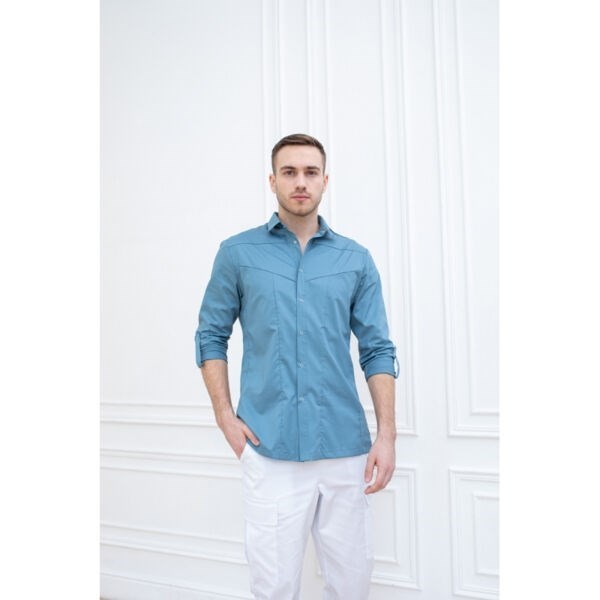 Мужская медицинская рубашка бренда Dr.Nice с длинным рукавом и отложным воротником имеет приталенный фасон. Длина рукава регулируется отворотом с закреплением кнопкой сбоку. Рубашка застегивается спереди на кнопки.
