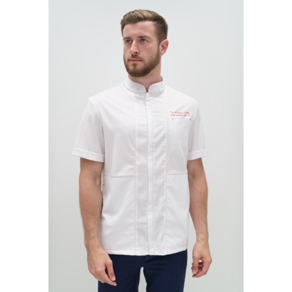 Медицинская мужская рубашка TZ700-WLR выполнена в современном крое с воротником-стойкой и короткими рукавами. Модель с супатной застежкой на молнии и имеет два нагрудных кармана и два боковых. Оригинальный дизайн рубашки представлен строчкой красного цвета, а на левом нагрудном кармане вышита надпись «Ты любишь лазер, как люблю его я?».