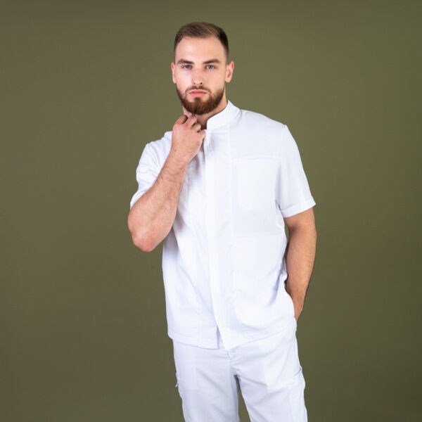 Медицинская мужская рубашка TZ700 выполнена в современном крое с воротником-стойкой и короткими рукавами. Модель с супатной застежкой на молнии и имеет два нагрудных кармана и два боковых.
