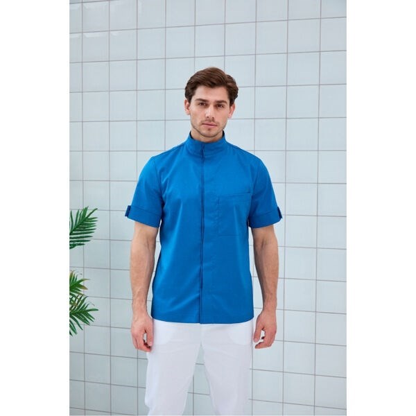 Мужская медицинская рубашка с коротким рукавом имеет манжеты, которые декорированы дополнительной деталью. Изделие застегивается на кнопки и дополнено нагрудным карманом.