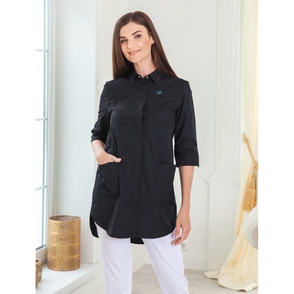 Изящный блузон "Берта" от White Wears с удлиненной задней полочкой и рукавами ¾ позволит выглядеть гармонично и произвести положительное впечатление на нового пациента. Модель свободного кроя, застегивается спереди на металлические кнопки. Для нужных мелочей предусмотрены два накладных вместительных кармана. Этот блузон станет вашей любимой вещью! Сочетайте его с брюками или юбкой, меняя образы. Помимо дизайна, преимуществом нашей модели является материал, из которого она выполнена - основная ткань: сатори (50% хлопок, 50% полиэфир). Это обеспечивает ее износоустойчивость при стирке и дезинфекции.