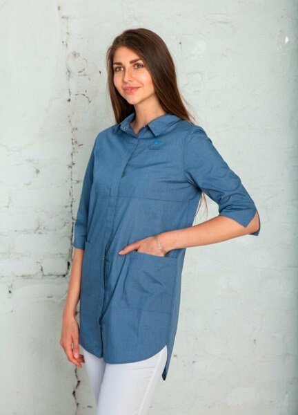 Изящный блузон "Берта" от White Wears с удлиненной задней полочкой и рукавами ¾ позволит выглядеть гармонично и произвести положительное впечатление на нового пациента. Модель свободного кроя, застегивается спереди на металлические кнопки. Для нужных мелочей предусмотрены два накладных вместительных кармана. Этот блузон станет вашей любимой вещью! Сочетайте его с брюками или юбкой, меняя образы. Помимо дизайна, преимуществом нашей модели является материал, из которого она выполнена - основная ткань: тиси (65% полиэфир, 35% хлопок). Это обеспечивает ее износоустойчивость при стирке и дезинфекции.