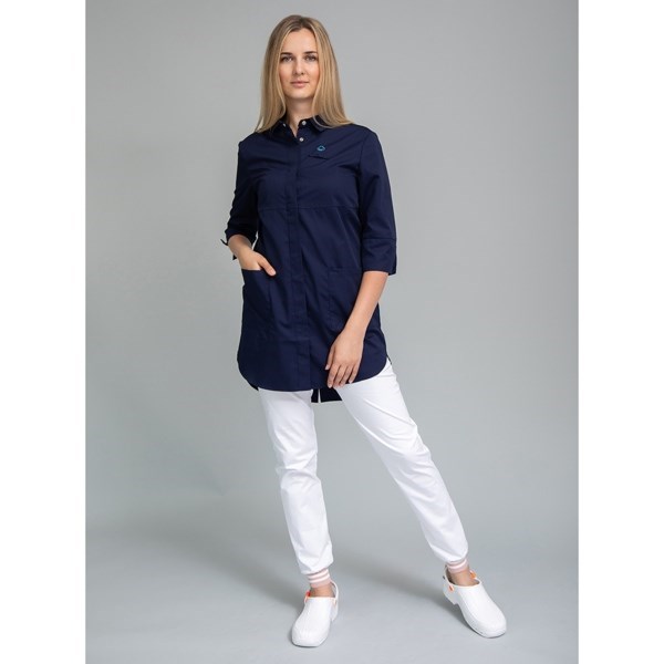 Изящный блузон "Берта" от White Wears с удлиненной задней полочкой и рукавами ¾ позволит выглядеть гармонично и произвести положительное впечатление на нового пациента. Модель свободного кроя, застегивается спереди на металлические кнопки. Для нужных мелочей предусмотрены два накладных вместительных кармана. Этот блузон станет вашей любимой вещью! Сочетайте его с брюками или юбкой, меняя образы. Помимо дизайна, преимуществом нашей модели является материал, из которого она выполнена - основная ткань: сатори (50% хлопок, 50% полиэфир). Это обеспечивает ее износоустойчивость при стирке и дезинфекции.