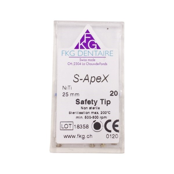 Файл S-Apex — это вращающийся NiTi инструмент с обратной конусностью, идеальное дополнение к любой системе эндодонтических файлов: он обеспечивает большую безопасность в случае сильно изогнутых, узких или облитерированных каналов. При превышении предела сопротивления разрушению файл S-Apex благодаря своей обратной конусности (диаметр D1 больше диаметра D2) ломается или сгибается в безопасной точке, то есть в 16 мм от кончика. Отлом инструмента легко удаляется из канала пинцетом, поскольку файл имеет особую, не ввинчивающуюся конструкцию, предотвращающую его застревание в канале. Обеспечивает более легкое проникновение ирригационных и дезинфицирующих растворов к верхушке даже в изогнутых и узких каналах. А также создает «апикальный уступ» для эффективной и безопасной обтурации.