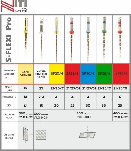 Описание: S-FLEXI Ассорти 25мм (7шт.)-Машинные файлы для первичного эндодонтического лечения