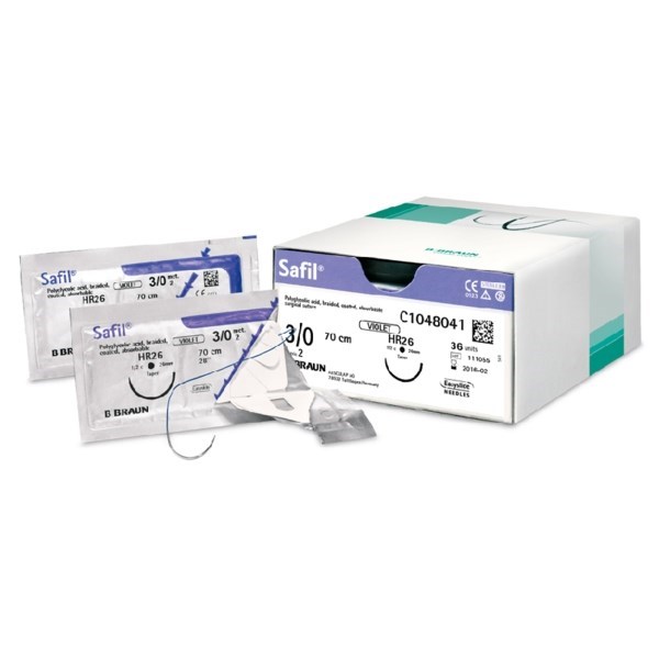 Сафил фиолетовый 4/0 (1,5) 45 см DS19, C1048220, (Bbraun) - синтетический рассасывающий шовный материал на основе 100% полигликолевой кислоты с покрытием из тройного сополимера гликоната со средним сроком абсорбции. Материал рассасывается путем гидролиза и обеспечивает предсказуемое время поддержки раны. Safil имеет плетенную структуру, для лучшей визуализации окрашен в фиолетовый цвет.
