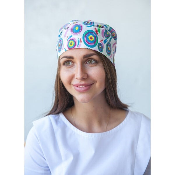 Медицинская шапочка из хлопка с принтом "Белые круги". Материал приятный на ощупь, не мнется, легко стирается, быстро сохнет.
