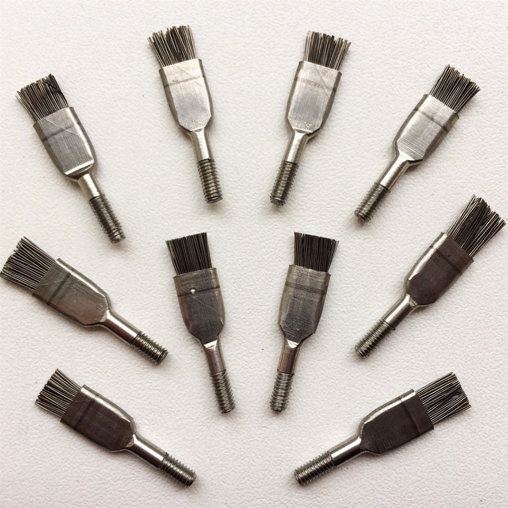 Щетка для чистки боров. Изготовлена из нержавеющей стали. Имеет резьбу М2,5 для установки на ручку для зеркал. Размеры длина 13 мм, ширина 5 мм, толщина в рабочей части 1,5 мм. Высота щетины 3-4 мм.