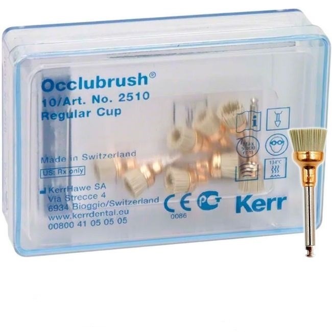 Щеточки Occlubrush - в форме стандартной "чашечки" для быстрой зеркальной полировки окклюзионных и вогнутых поверхностей реставраций из композитов, компомеров, стеклоиономеров и керамики, а также для профилактической обработки. Полировальные частицы импрегнированы в каждую щетинку, поэтому пасты не требуется. Щетинки из специального волкна с абразивными частицами карбида кремния. Зеркальный блеск достигается быстрее, чем при использовании обычных полиров. Не повреждает эмаль зубов, поверхности и края пломб. Автоклавируется при температуре до 134°С без потери рабочих качеств. Упаковка 10 шт.