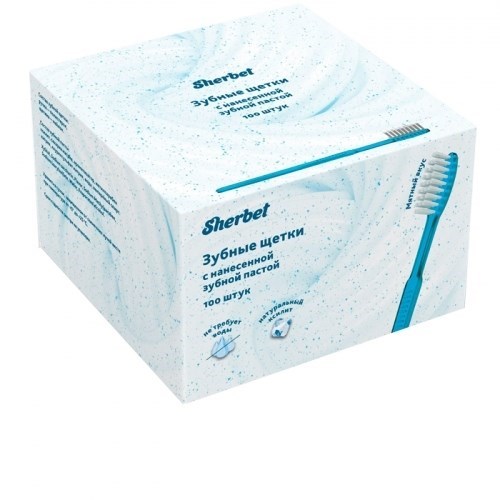 Описание: Щетки зубные одноразовые SHERBET 100шт. с нанесенной зубной пастой, «Мятный мусс» с ксилитоломЩетка зубная одноразовая SHERBET с нанесенной зубной пастой, 1шт. «Мятный мусс» с ксилитолом.