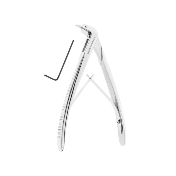 Щипцы клювовидные ортопедические, для удаления искусственной коронковой части зуба на постоянной цементной фиксации. Снабжены сводящей рабочие части пружиной. Рабочие части утончены для позиционирования между краев распила ортопедической конструкции. Могут применяться для всех групп зубов. На ручках крупный поперечный ретенционный рельеф.