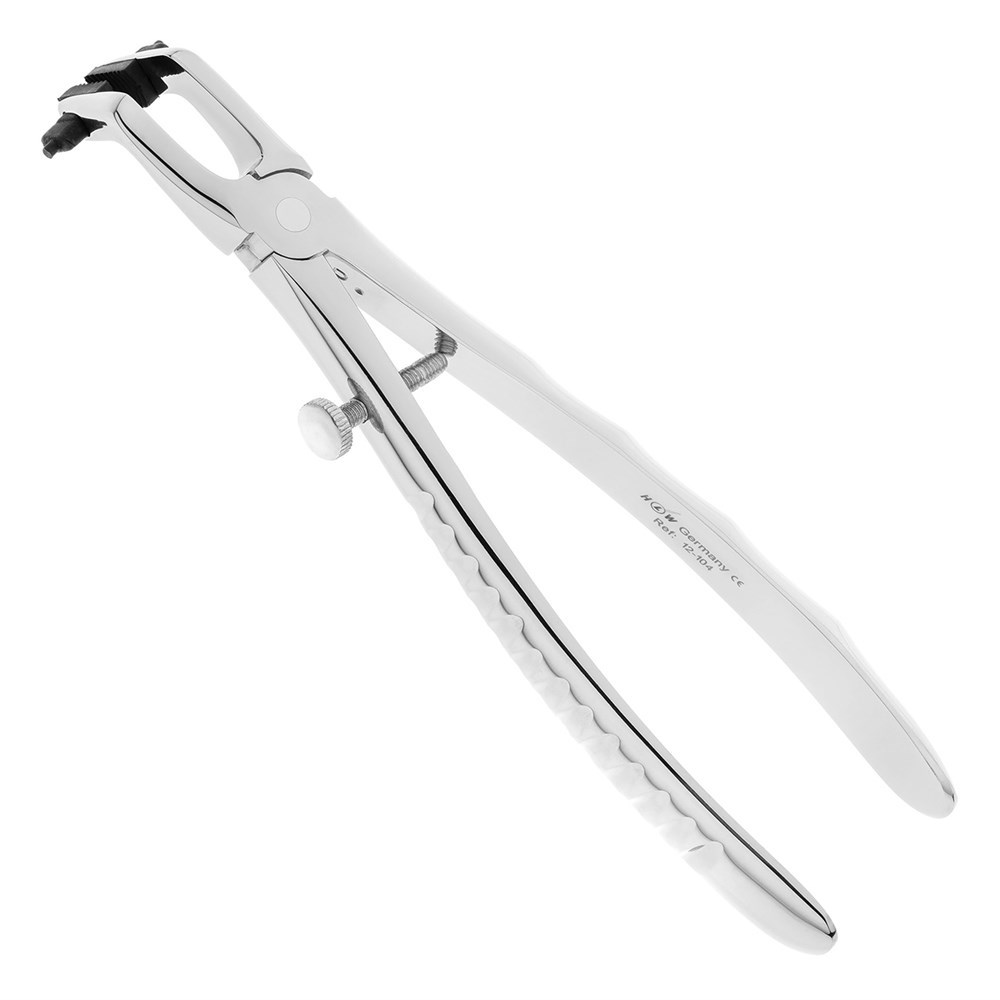 В одну из ручек инструмента ввинчен ограничитель хода рабочих частей, предотвращающий излишнее сдавливание и деформацию хрупких ортопедических конструкций.