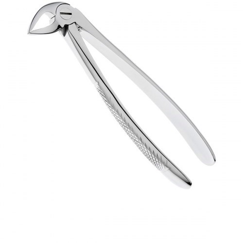 Щипцы 11-33S для удаления нижних корневых зубов, детские разработаны немецкой фирмой HLW Dental Instruments для удаления корней молочных зубов на нижней челюсти. Рабочие поверхности инструмента узкие с продольно-поперечными насечками на внутренней стороне, закругленные на концах и несходящиеся при смыкании. Щечки клювовидных щипцов расположены под углом 90° относительно продольной оси инструмента. При удалении корней зубов на нижней детской челюсти такая конструкция обеспечивает надежную фиксацию щипцов на корне и дает возможность ввести инструмент глубоко в полость рта. Наружная поверхность стандартных ручек покрыта ретенционным узором, предотвращающим скольжение фаланг пальцев в перчатке. Небольшой размер инструмента разработан согласно детским анатомическим особенностям.