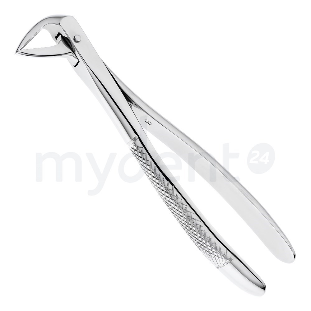 Рабочие части щипцов сходящиеся, узкие, удлиненные и имеют продольно-поперечные насечки на внутренних поверхностях щечек инструмента, за счет которых осуществляется надежный захват и фиксация щипцов на корне зуба.