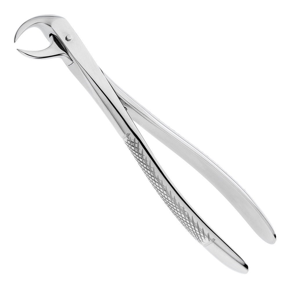 Щечки инструмента округлые, гладкие, заостренные на концах и несходящиеся. Такая конструкция рабочих частей облегчает наложение и повышает надежность фиксации щипцов на удаляемом зубе.
