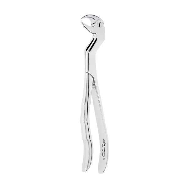 Щипцы для удаления третьих моляров на нижней челюсти справа. Форма №186R. Щипцы имеют одиночный изгиб по принципу байонета. Бранши не сходящиеся симметричные, имеют пирамидальную форму с острой вершиной, повернуты под углом в 90 градусов к продольной оси инструмента в форме клюва.