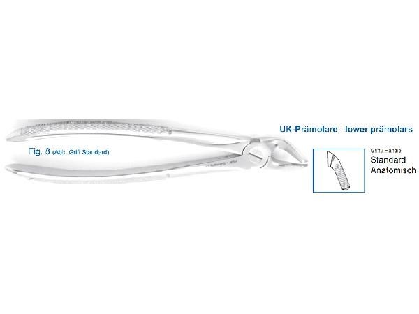 Для удаления премоляров на нижней челюсти используются щипцы формы №8 производства компании HLW Dental Instruments.