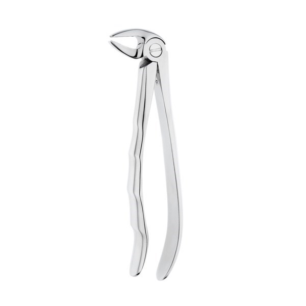 Щипцы для удаления премоляров на нижней челюсти клювовидные. Форма №13. Щипцы имеют изгиб по ребру. Бранши не сходящиеся. Внутренняя поверхность рабочей части имеет поперечно-продольные насечки.
