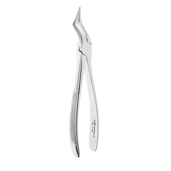 Щипцы для удаления корней на верхней челюсти узкие удлиненные. Форма №152. Бранши полностью сходящиеся удлиненные. Рабочая часть имеет штыковидный (байонетный) изгиб. Внутренняя поверхность рабочей части имеет поперечно-продольные насечки.