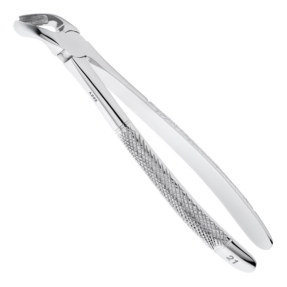 Щипцы формы №21 немецкой торговой марки Nopa Instruments применяются для удаления моляров на нижней челюсти. Не сходящиеся рабочие части щипцов заканчиваются шипами для осуществления плотного захват моляра и проникновения в область бифуркации. Внутренняя поверхность щечек имеет продольно-поперечные насечки, которые обеспечивают фиксацию инструмента на удаляемом зубе.