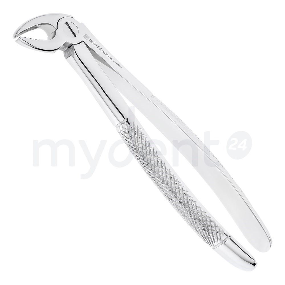 Щипцы формы №4 производятся компанией Nopa Instruments Medizintechnik GmbH и используются для удаления резцов и клыков на нижней челюсти. Удлиненные не сходящиеся рабочие части щипцов, расположенные под тупым углом к продольной оси инструмента, способствуют удалению зубов фронтальной группы на нижней челюсти. Продольно-поперечные насечки на внутренних поверхностях щечек инструмента обеспечивают надежную фиксацию щипцов на поверхности зуба.