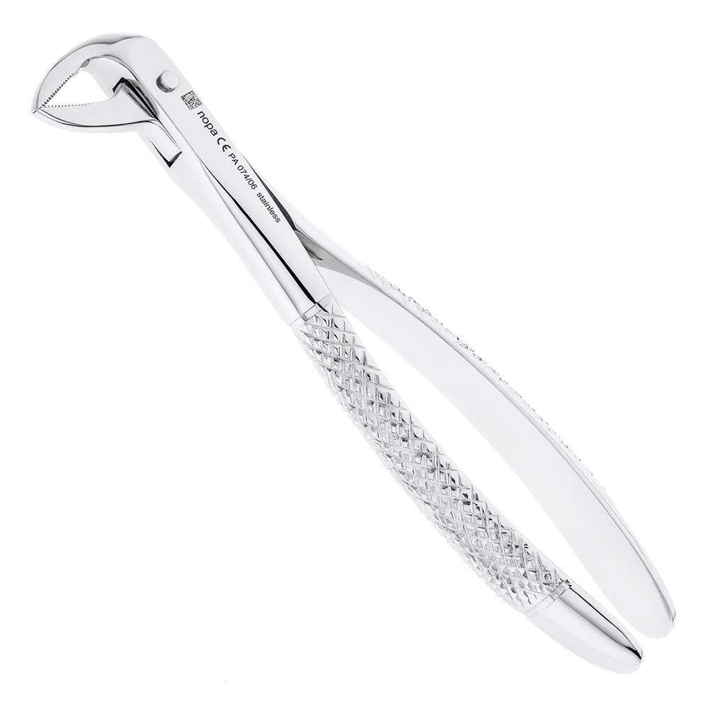 Клювовидные щипцы формы №74M производства немецкой компании Nopa Instruments Medizintechnik GmbH предназначены для удаления корней зубов на нижней челюсти. Внутренняя поверхность сходящихся щечек инструмента имеет поперечно-продольные насечки, благодаря которым производится фиксация на корне зуба.