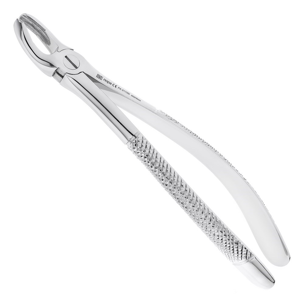 Щипцы для удаления правых моляров на верхней челюсти производства nopa instruments Medizintechnik GmbH Germany имеют форму №17. Рабочие части щипцов не сходящиеся, с продольно-поперечными насечками на внутренней поверхности, благодаря чему обеспечивается качественная фиксация на удаляемом зубе. Одна из рабочих частей имеет шип, который вводится в область бифуркации.