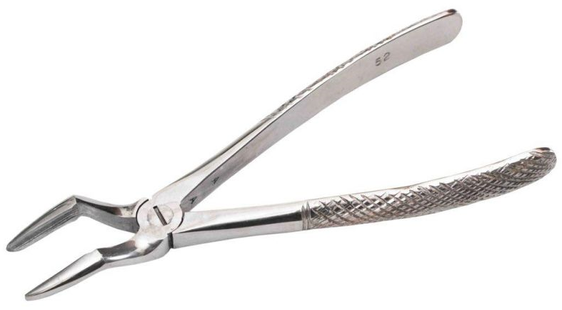 Щипцы для удаления корней зубов верхней челюсти с широкими губками № 52, имеющие форму щечек, соответствующую анатомическим особенностям отдельных зубов.