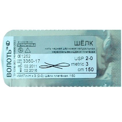 Описание: Шелк плетеный 3/0 Режущая игла (20мм.), 1/2 окружности, длина нити 75см. (1шт.), ВолотьШелковые крученые нити натуральные нерассасывающиеся обладают реактогенностью. Благодаря мягкости, гибкости, прочности позволяют вязать два узла.