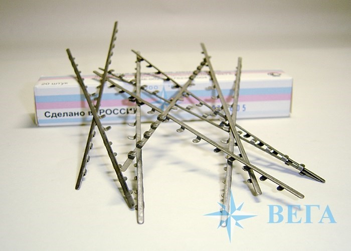 Шина назубная ленточная Васильева - предназначена для закрепления и межчелюстного вытяжения отломков при лечении переломов челюстей. Изготовлена методом холодной штамповки из ленты коррозионной и жаростойкой стали. Поверхность шины матовая или блестящая. Длина 134 мм. Упаковка 20 шт.