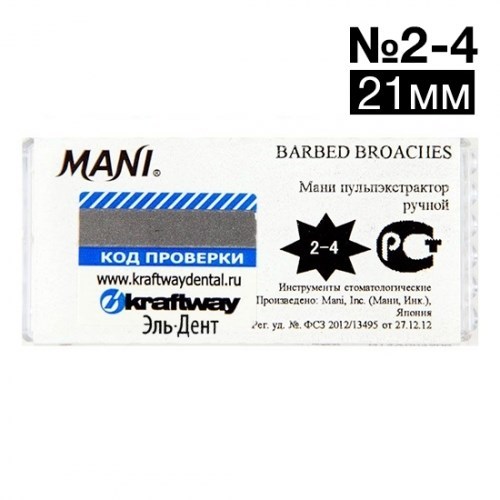 Short Barbed Broaches №2-4 (21 мм), Mani (упак. 6 шт.) - пульпоэкстракторы ручные короткие АССОРТИ