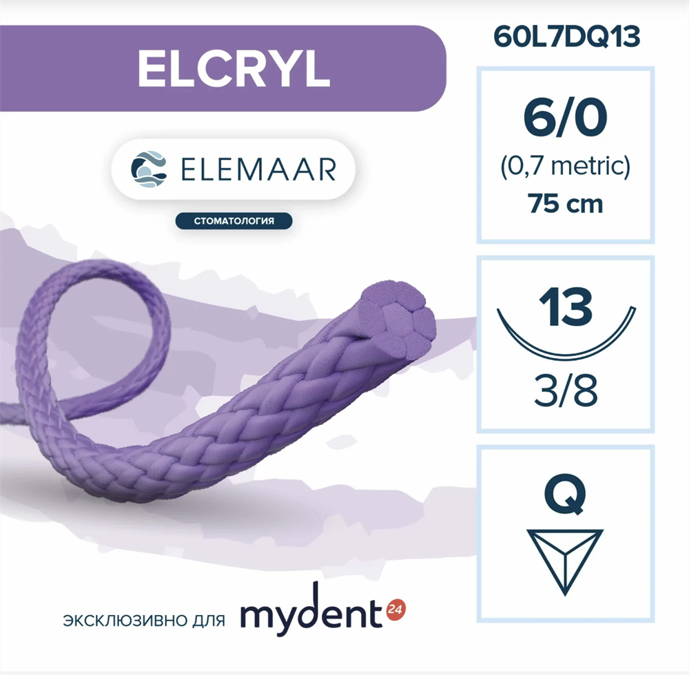 60L7DQ13 ELCRYL Нить сополимерная (гликолид 90 - L-лактид 10) с покрытием, плетёная, фиолетовая, рассасывающаяся, толщина 6/0(0,7), длина 75см, игла DQ 13мм (12 шт.)