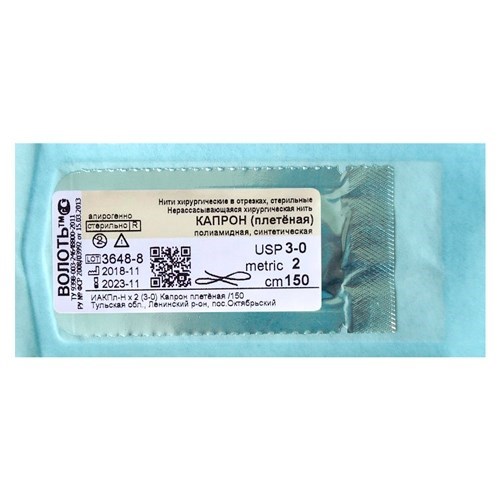 Капрон – это синтетический условно нерассасывающийся (биодерградация происходит в течение 1-2 лет) шовный материал. Нити капрона биологически инертны, непирогенны, вызывают минимальную реакцию тканей. Химический состав нити Капрон: модифицированный полиамид. Нити капрона проходят радиационную стерилизацию.