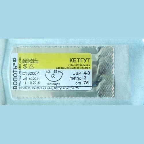 Кетгут простой с атравматической колющей иглой. Хирургический натуральный шовный материал рассасывающийся. Изготовлен из очищенной соединительной ткани подслизистого слоя тонкого кишечника овец или серозного слоя тонкого кишечника крупного рогатого скота. Выпускается в стерильной и герметичной упаковке и не требует дополнительной стерилизации. Полное рассасывание в течение 25-120 суток. Потеря 50% прочности через 7 дней. Условный размер (USP) - 3/0. Метрический размер (EP) - 3. Диаметр нити 0,3 мм, длина 75 см. Игла длиной 17 мм с изгибом 1/2.