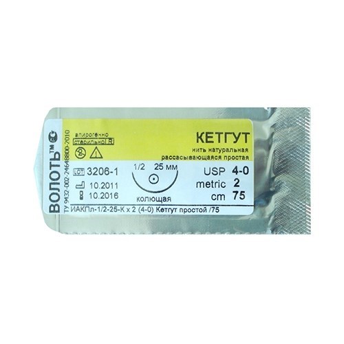 Кетгут простой с атравматической колющей иглой. Хирургический натуральный шовный материал рассасывающийся. Изготовлен из очищенной соединительной ткани подслизистого слоя тонкого кишечника овец или серозного слоя тонкого кишечника крупного рогатого скота. Выпускается в стерильной и герметичной упаковке и не требует дополнительной стерилизации. Полное рассасывание в течение 25-120 суток. Потеря 50% прочности через 7 дней. Условный размер (USP) - 3/0. Метрический размер (EP) - 3. Диаметр нити 0,3 мм, длина 75 см. Игла длиной 20 мм с изгибом 1/2 окружности. Срок годности 5 лет со дня стерилизации.
