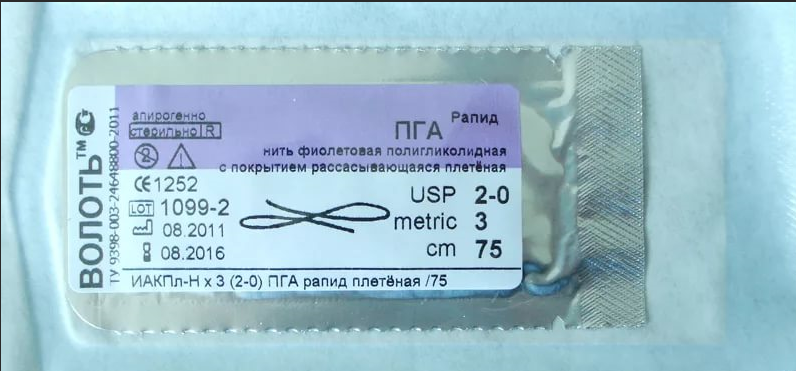 Плетеная рассасывающаяся нить из полиглактида 910, покрытая полиглактином 370 и стеаратом кальция. 1/2 потеря прочности через 14  дней,  полное рассасывание в диапазоне 56-70 дней(согласно запросу) .Нить фиолетовая, толщина 5-0, длина 75 см, игла колющая 1/2 окружности, длина 17 мм. Индивидуальная стерильная упаковка нити выполнена из фольги, что препятствует проникновению света и разрушению нити.