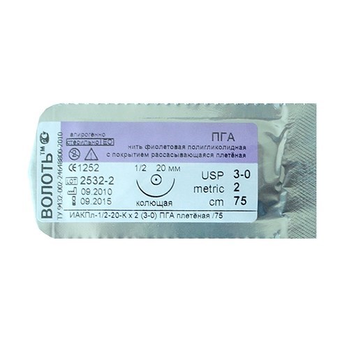 Шовный материал ПГА 5/0 плетеная, L75 см, игла 20 мм, изгиб 1/2, колющая одноигольная